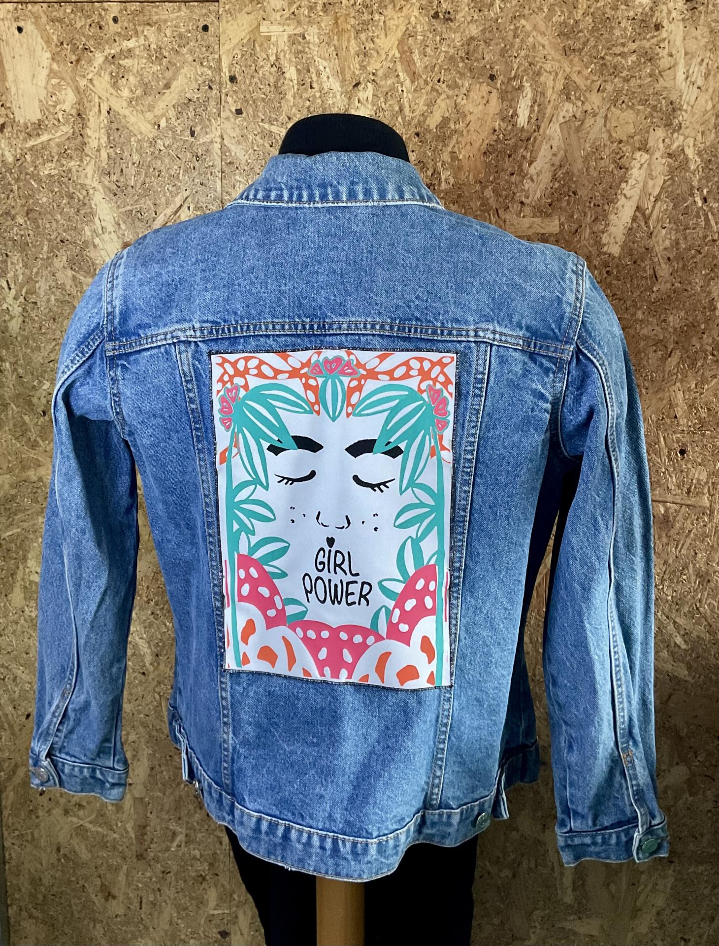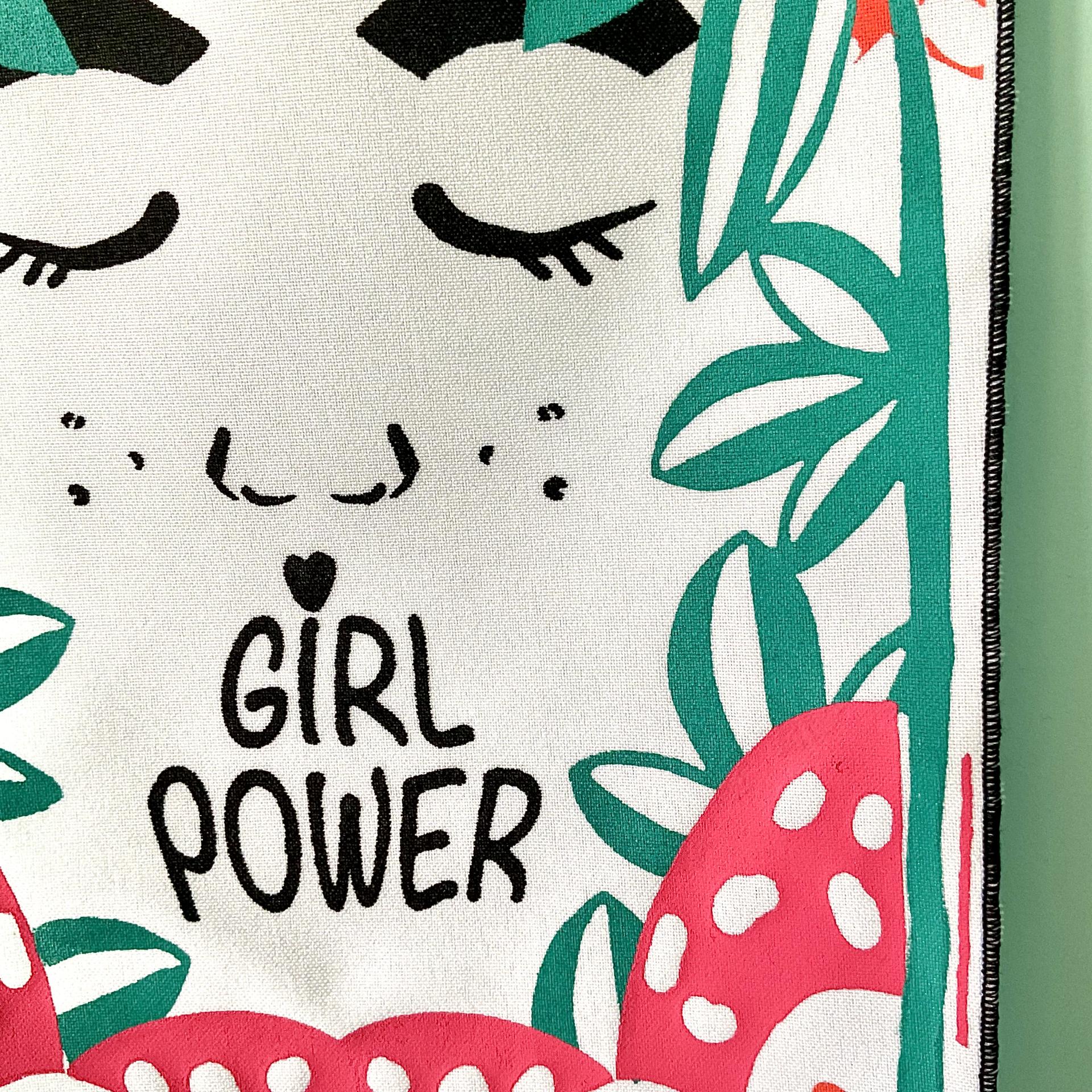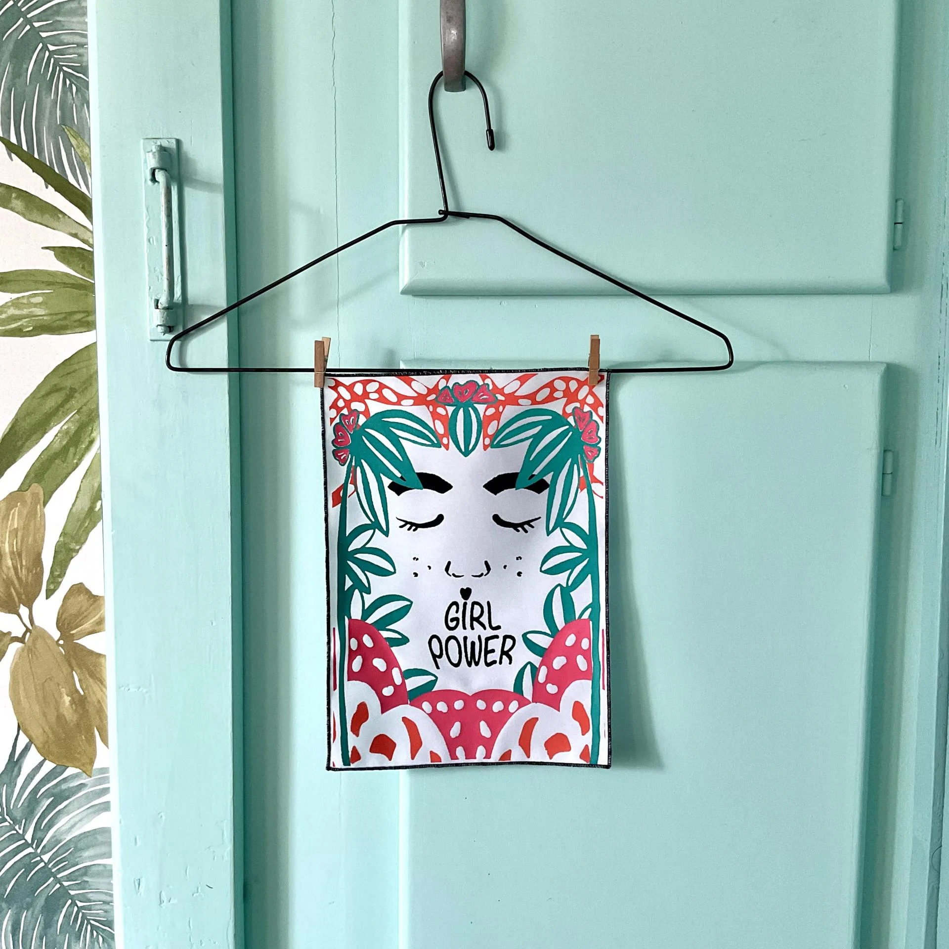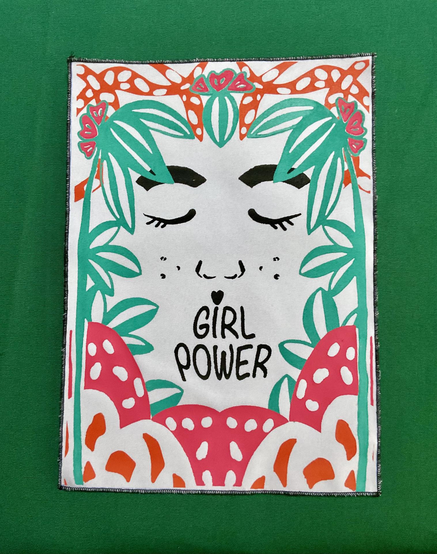 Sur un tissu blanc bordé d’un surjet noir, on découvre un visage paisible entouré de végétation luxuriante, où les mots “Girl Power” remplacent la bouche — un message fort, poétique et vibrant.